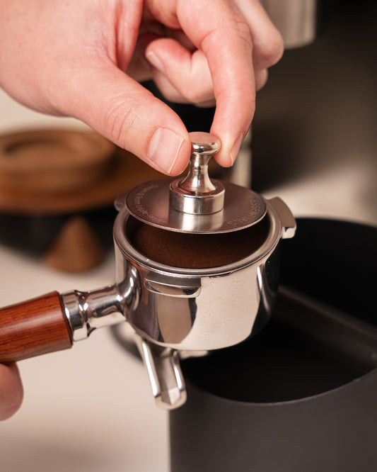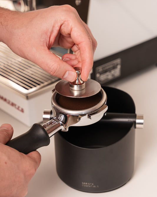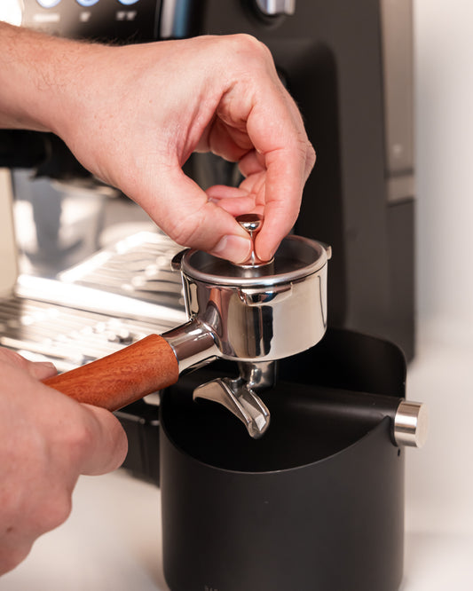 Dat scheelt peuteren in je portafilter en zoeken in je knock box als je ‘m per ongeluk met je gebruikte puck hebt uitgeklopt. 😅
