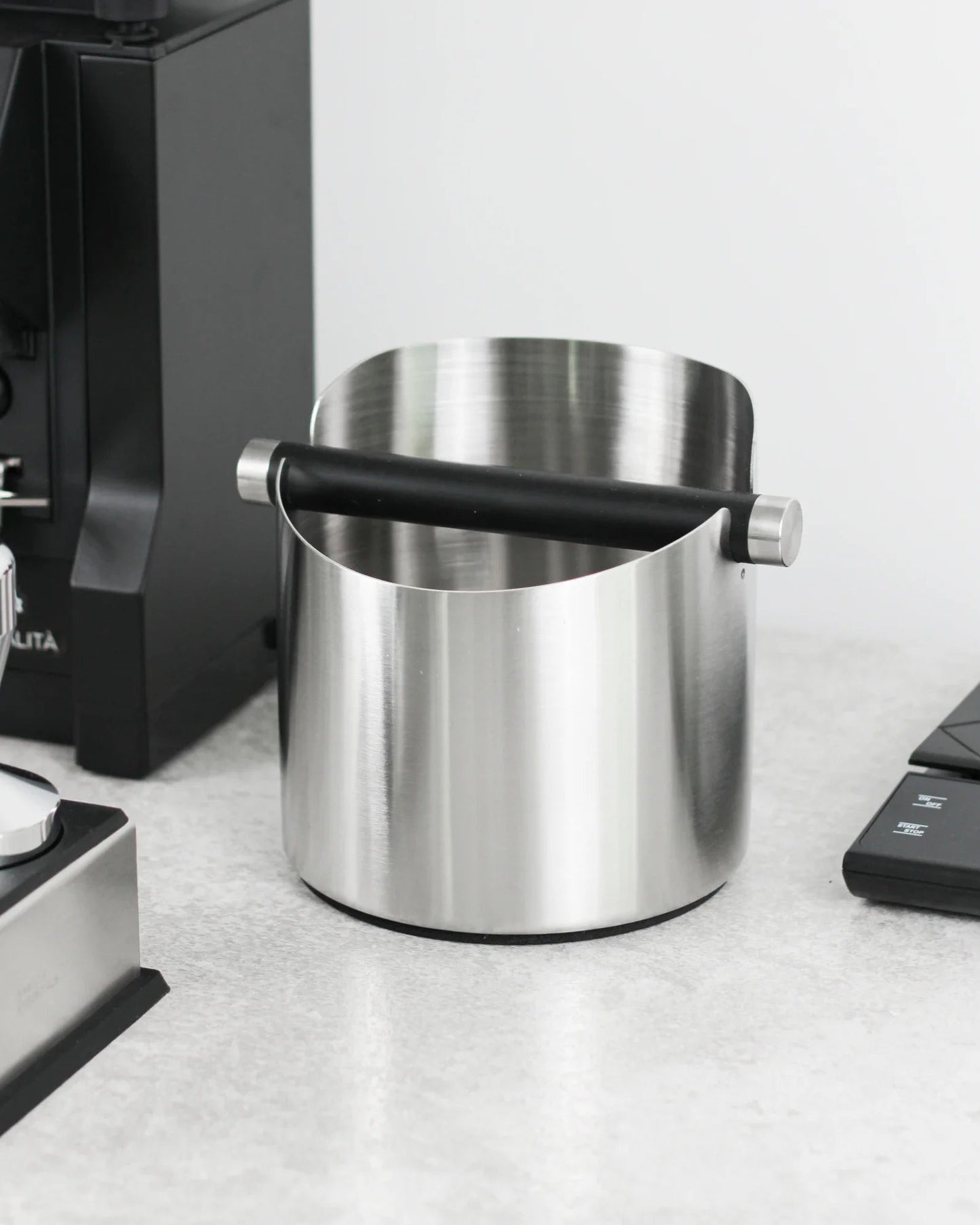 Bij een nieuwe espressomachine krijg je vaak geen uitklopbak (knock box). Dat betekent dat je na elke espresso heen en weer moet naar de prullenbak.