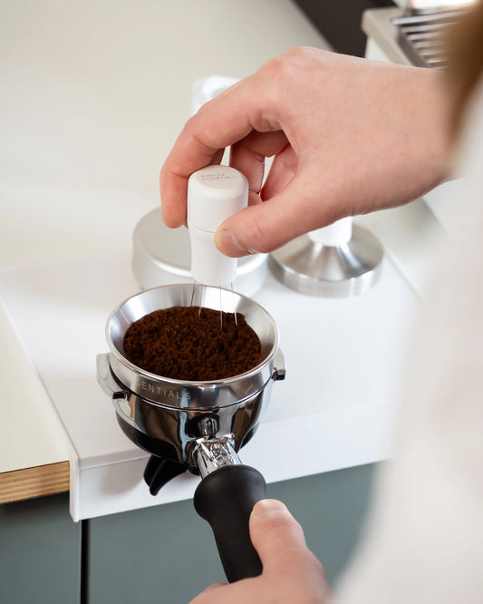 Na het malen roer je met deze tool door de koffie (zorg dat je doseerring er nog op zit). Zo breek je alle klontjes en verdeel je de koffie perfect voor het tampen. En geloof me: dit maakt meer impact dan je denkt.
